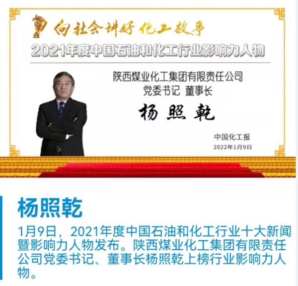 2022年1月9日,由中國石油和化學(xué)工業(yè)聯(lián)合會指導(dǎo),《中國化工報》社有限公司主辦的“2021年度石油和化工行業(yè)十大新聞暨影響力人物發(fā)布盛典”采用線上直播的形式舉行。陜煤集團黨委書記、董事長楊照乾榮膺“2021年度中國石油和化工行業(yè)影響力人物”。