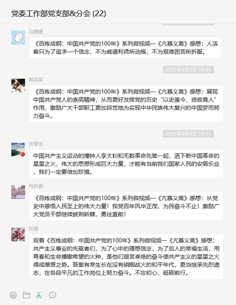 公司所屬各級黨組織堅持每日在支部工作群中推送《百煉成鋼:中國共產(chǎn)黨的100年》系列微視頻,通過8分鐘學(xué)習(xí)百年黨史,讓黨員干部更加理解中國共產(chǎn)黨為什么能、馬列主義為什么行,中國特色社會主義為什么好。利用“微分享”小窗口、大視角的形式開展黨史學(xué)習(xí)教育,打造指尖上的思想“加油站”。目前,公司所屬各級黨組織已推送《百煉成鋼:中國共產(chǎn)黨的100年》系列微視頻12期,每期都引發(fā)了黨員干部的熱評熱議。