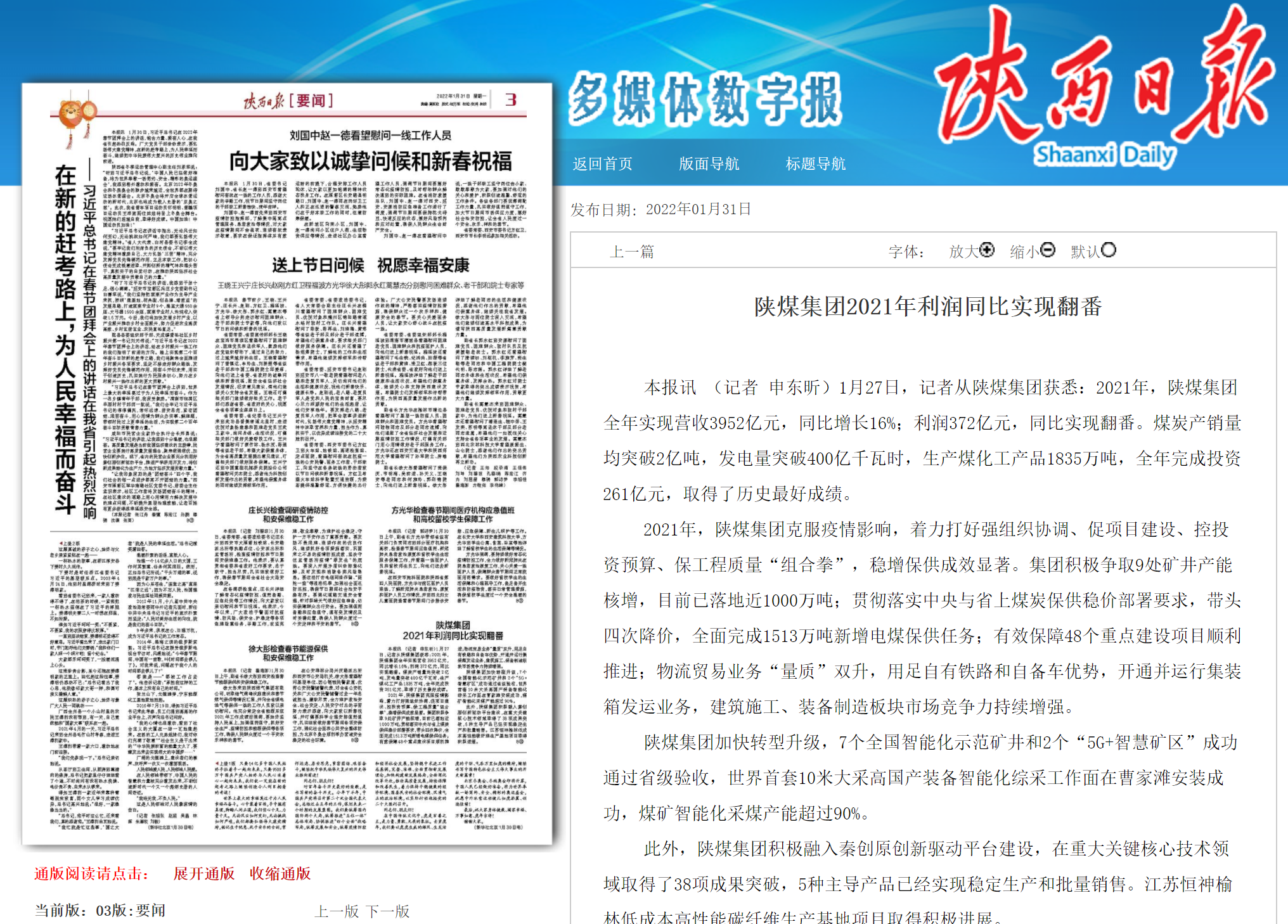 陜西日報(bào) | 陜煤集團(tuán)2021年利潤同比實(shí)現(xiàn)翻番